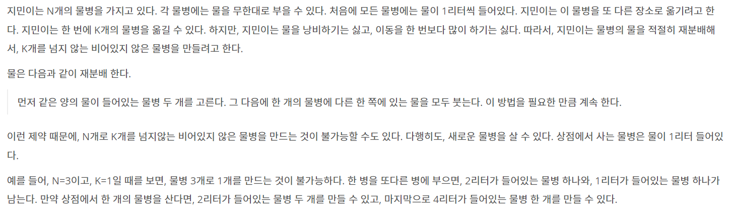 지민이는 N개의 물병을 가지고 있다. 각 물병에는 물을 무한대로 부을 수 있다. 처음에 모든 물병에는 물이 1리터씩 들어있다. 지민이는 이 물병을 또 다른 장소로 옮기려고 한다. 지민이는 한 번