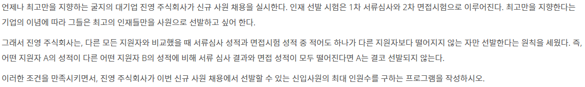 각 테스트 케이스에 대해서 진영 주식회사가 선발할 수 있는 신입사원의 최대 인원수를 한 줄에 하나씩 출력한다.
