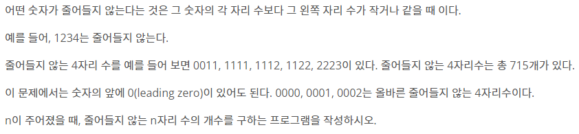 ② 숫자의 앞에 0이 있어도 된다. 0000, 0001, 0002는 올바른 줄어들지 않는 수 -> arr[1]0 = 1, arr[1]1 = 1, ...