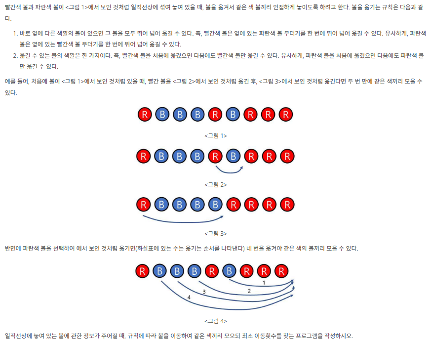 ② 빨간 공을 움직여 왼쪽으로 모으는 경우, 빨간 공을 움직여 오른쪽으로 모으는 경우, 파란 공을 움직여 왼쪽으로 모으는 경우, 파란 공을 움직여 오른쪽으로 모으는 경우 → 네 가지 경우 공을 움직이는 횟수를 각각 구해서 최솟값을 찾는다