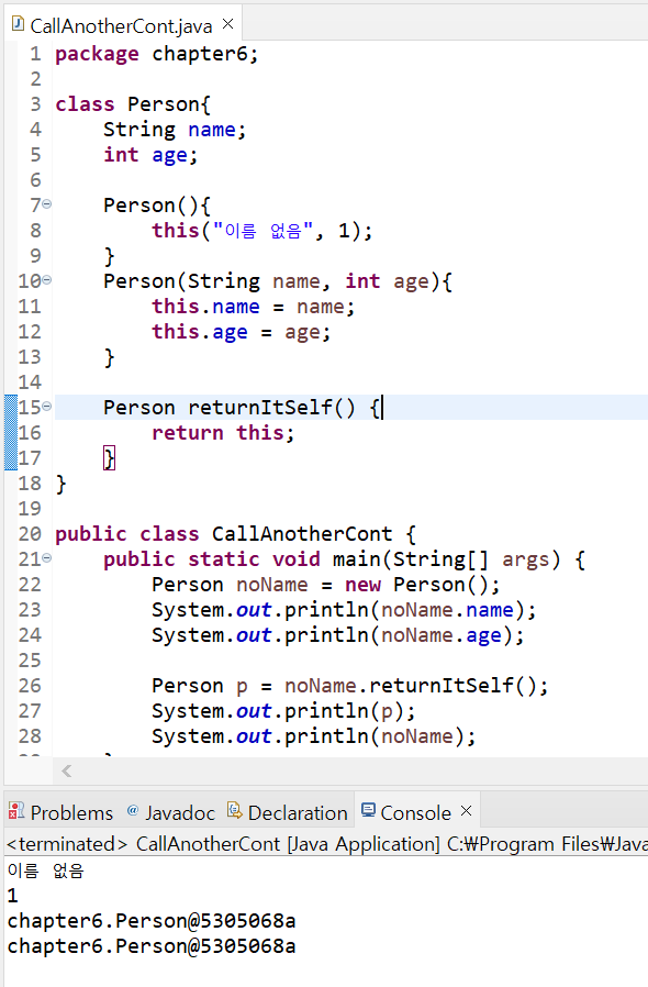 line 7에서는 생성자 Person()에서 this를 사용해 다른 생성자 Person(String name, int age)를 호출하고 있습니다. 이때 line 8의 this("이름 없음", 1); 앞에는 다른 코드를 넣을 수 없습니다. line 15에서는 returnItSelf() 함수를 통해, 생성된 클래스 자신의 주소 값을 반환하고 있습니다. return이 포함된 반환형 함수 returnItSelf()를 선언할 때는 클래스형인 Person으로 선언해야 합니다.