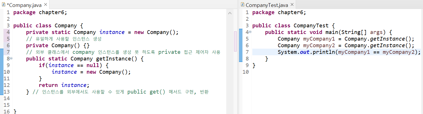 유일하게 사용할 Company 인스턴스를 생성한 뒤 public get() 메서드를 통해 외부 클래스에서도 인스턴스를 받아와 사용할 수 있게 구현했습니다. CompanyTest.java에서 두 변수를 만들어 getInstance() 메서드를 통해 인스턴스를 받아왔고, 두 변수의 주소 값이 같은 것을 확인했습니다.