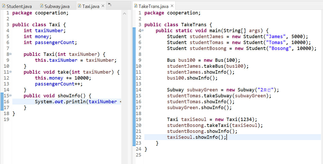 학생, 버스, 지하철, 택시 객체를 정의한 뒤 TakeTrans.java에서 객체 간 협력 기능을 구현했습니다. 학생이 버스, 지하철, 택시에 타는 것을 각 클래스 내 메서드로 구현했습니다.