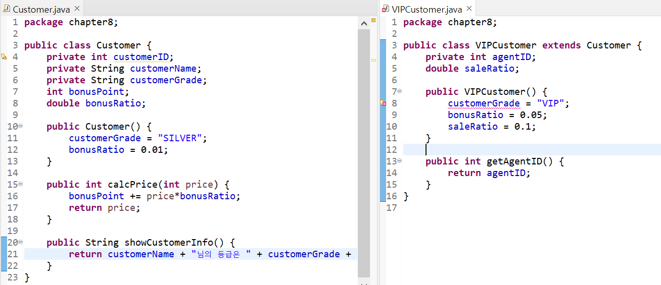 위 문제를 해결하기 위해 Customer 클래스를 조금 수정했습니다. private로 선언된 멤버 변수들을 protected 예약어로 수정했는데, protected로 선언된 변수들은 하위 클래스에서는 public처럼 사용되고 외부에서는 private처럼 사용됩니다.