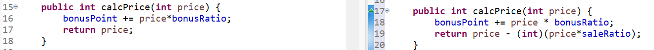 Customer 클래스의 calcPrice() 메서드를 VIPCustomer 클래스에서 재정의한 것입니다. 오버라이딩 시 메서드를 코드에 직접 작성하거나, 이클립스에서 Source - Override/Implement Methods… 기능을 사용할 수 있습니다.